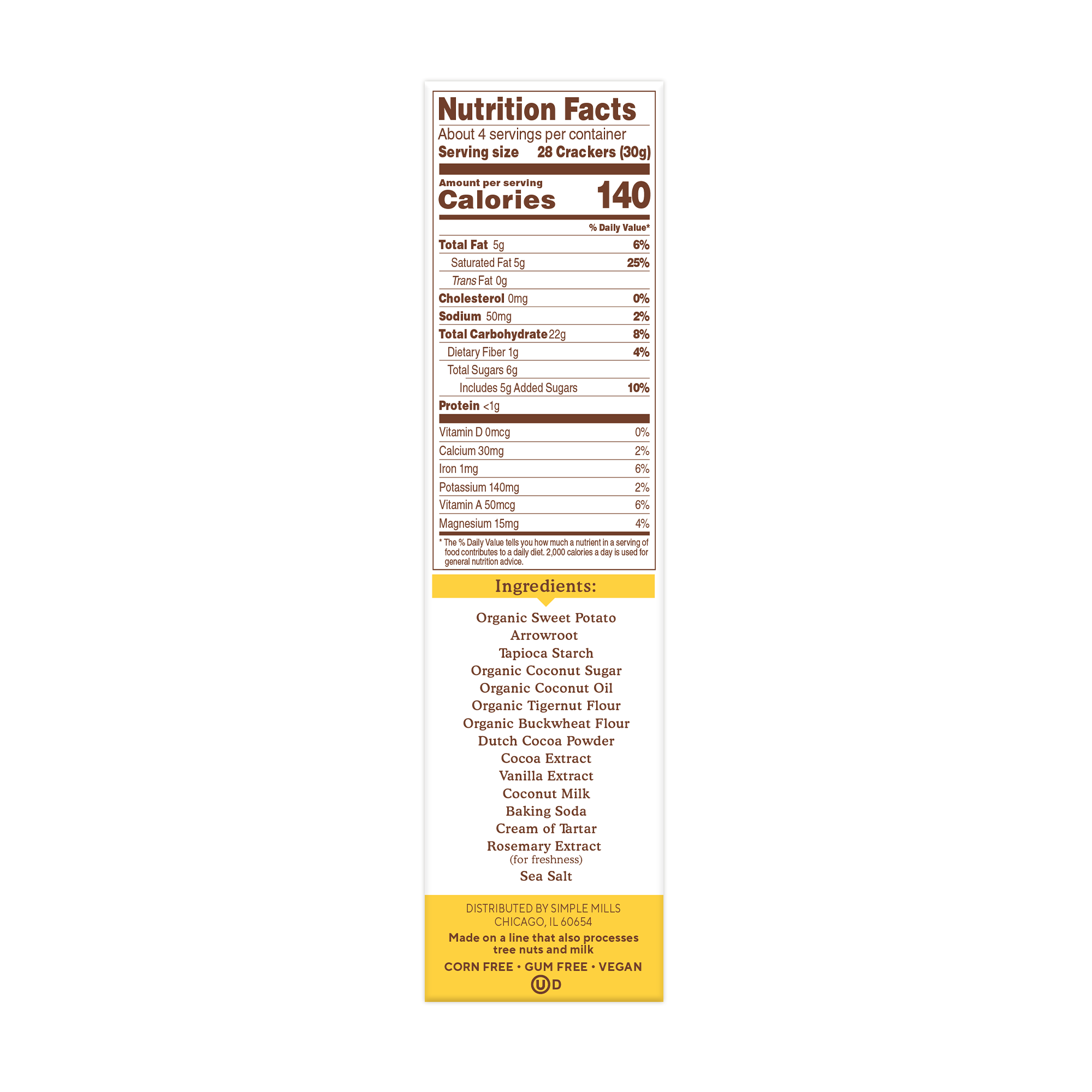 SIMPLE INGREDIENTS: Organic Sweet Potato, Arrowroot, Tapioca Starch, Organic Coconut Sugar, Organic Coconut Oil, Organic Tigernut Flour, Organic Buckwheat Flour, Dutch Cocoa Powder, Cocoa Extract, Vanilla Extract, Coconut Milk, Baking Soda, Cream of Tartar, Rosemary Extract (for freshness), Sea Salt