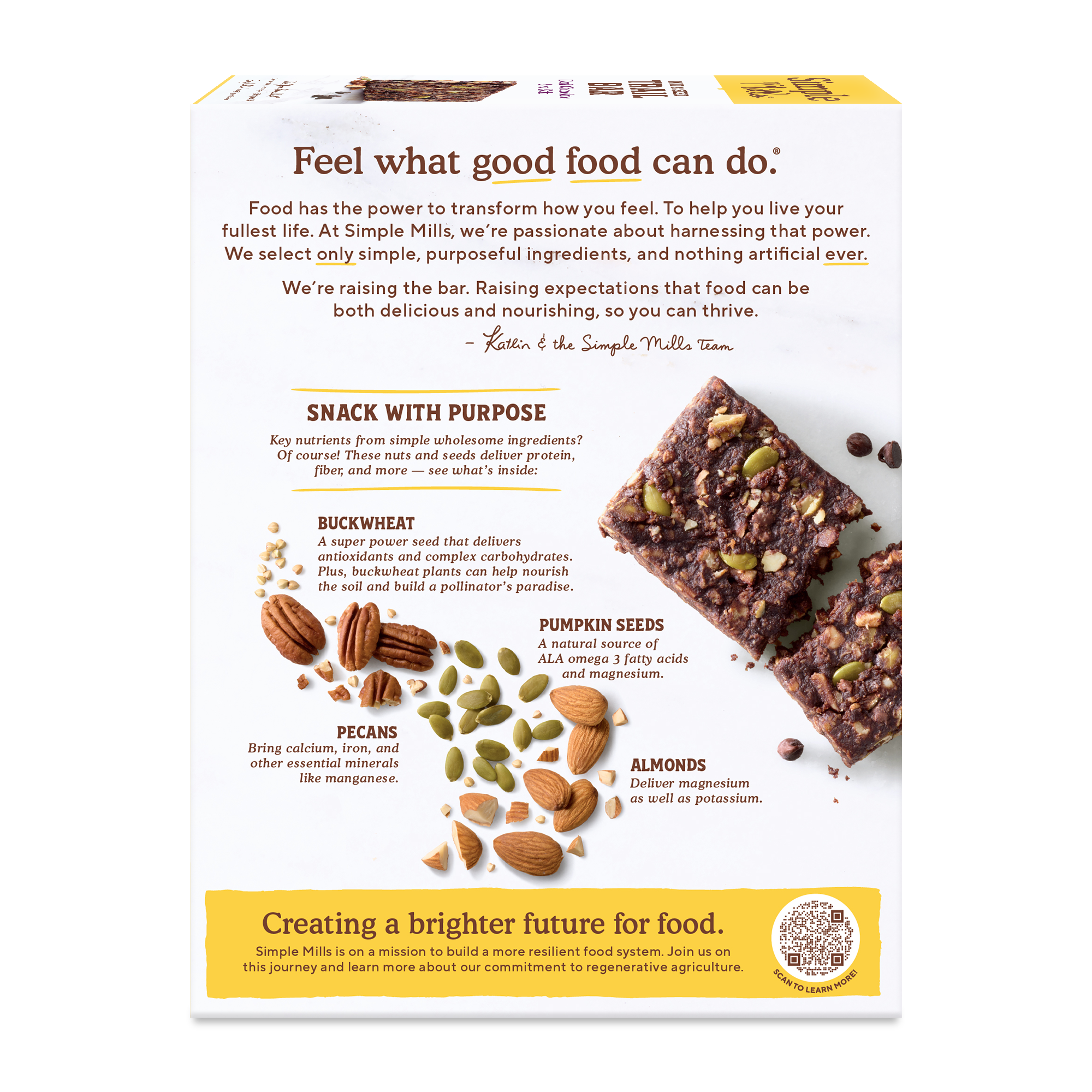 Made with purposeful ingredients like buckwheat, plus pecans, almonds, and pumpkin seeds, each bar is finished with rich dark chocolate and a touch of sea salt for the perfect sweet-salty balance.