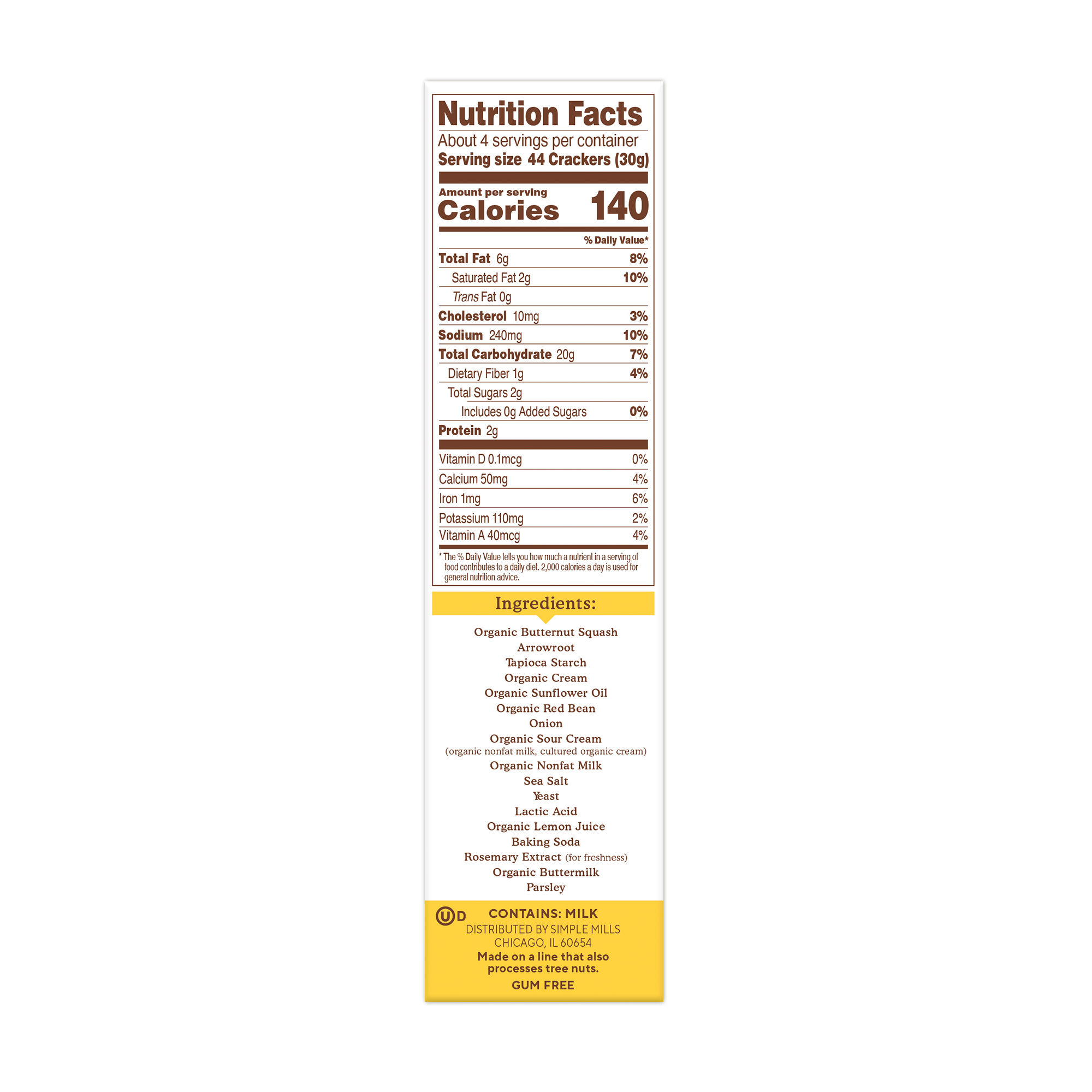 SIMPLE INGREDIENTS: Organic Butternut Squash, Arrowroot, Tapioca Starch, Organic Cream, Organic Sunflower Oil, Organic Red Bean, Onion, Organic Sour Cream (organic nonfat milk, cultured organic cream), Organic Nonfat Milk, Sea Salt, Yeast, Lactic Acid, Organic Lemon Juice, Baking Soda, Rosemary Extract (for freshness), Organic Buttermilk, Parsley