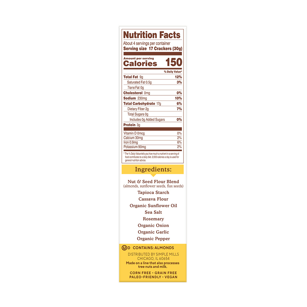 SIMPLE INGREDIENTS: Nut and Seed Flour Blend (Almonds, Sunflower Seeds, Flax Seeds),Tapioca Starch, Cassava Flour, Organic Sunflower Oil, Sea Salt, Rosemary, Organic Onion, Organic Garlic, Organic Pepper