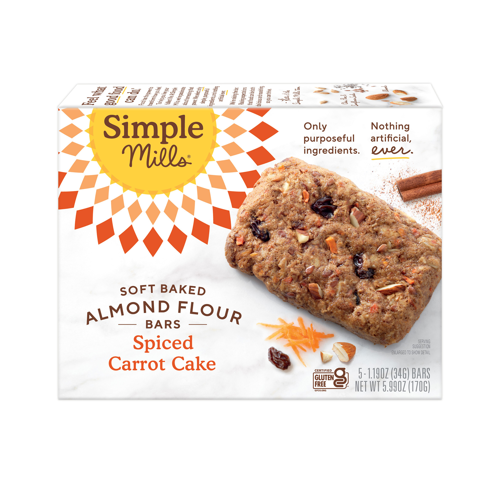SIMPLE INGREDIENTS: Almonds, Organic Coconut Nectar, Seed & Seed Flour Blend (sunflower, flax, chia), Tapioca Starch, Organic Coconut Oil, Molasses, Organic Raisins, Carrots, Almond Butter, Raisin Juice Concentrate (for freshness), Egg Whites, Organic Spices (cinnamon, nutmeg, clove, ginger), , Sea Salt, Baking Soda, Rosemary Extract (for freshness)
